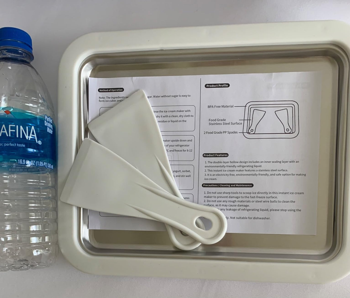The ice cream tray is made of food-grade aluminum with a durable, BPA-free plastic frame. The included scrapers are also made from food-grade plastic. Tray dimensions are 17.5 cm x 22.5 cm — perfectly sized for fun, mess-free rolled ice cream batches at home!